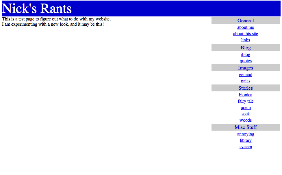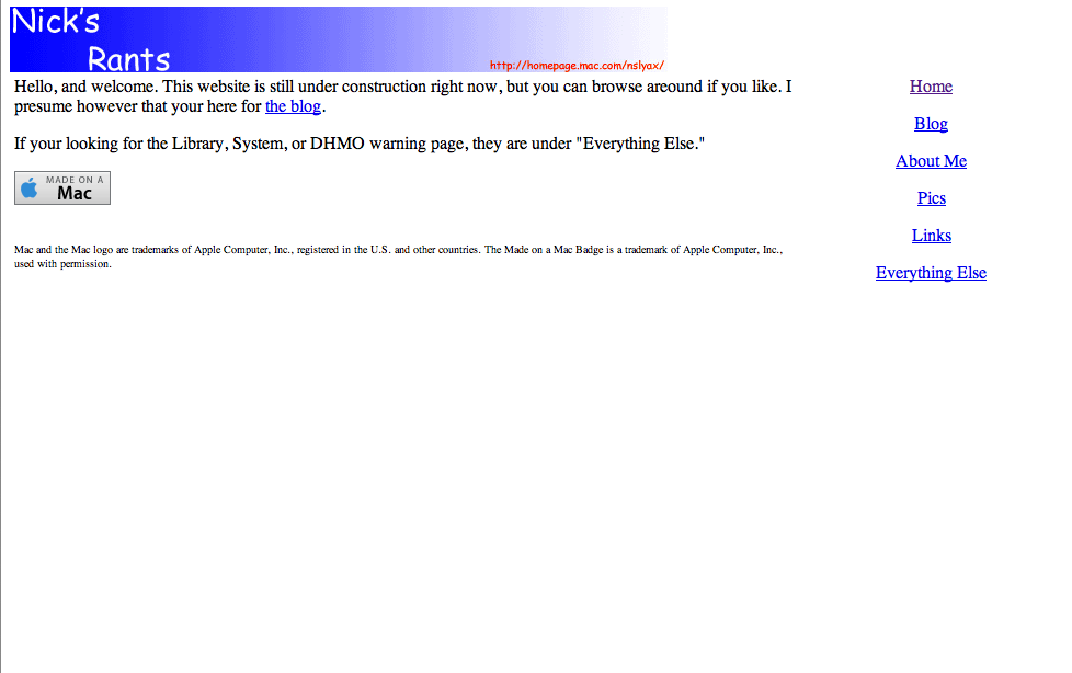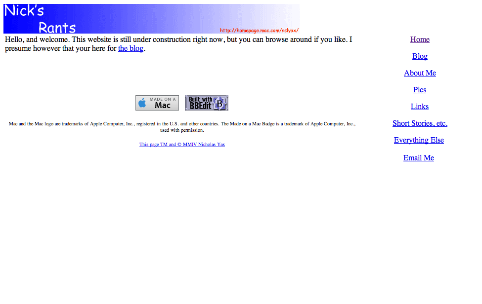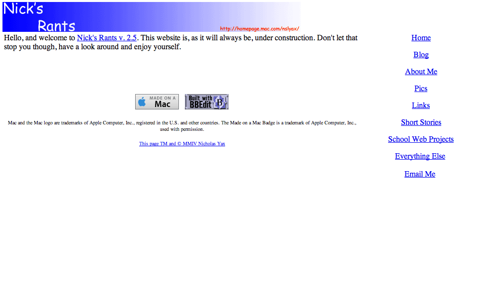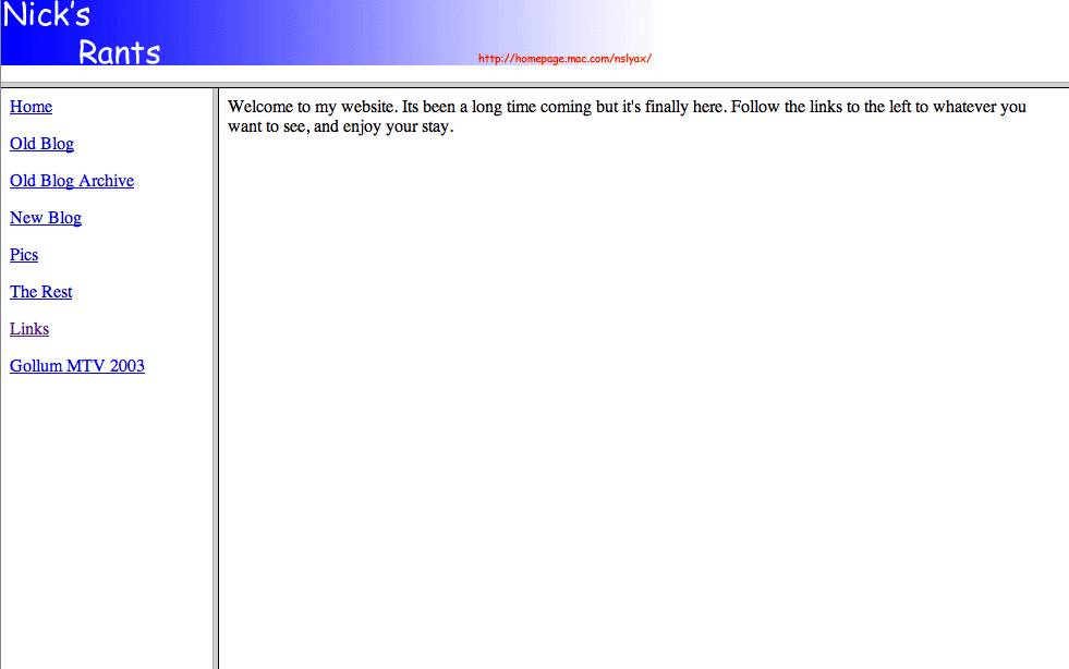 After I started to blog in May 2003, I found the need for a website, and by June I created Nick’s Rants to host pictures for the blog (at the time on Blogger). Originally, it was planned to be hosted in my geocities webspace, but I decided since I was paying for .Mac, why not use it. Built using Adobe GoLive with frames for layout.