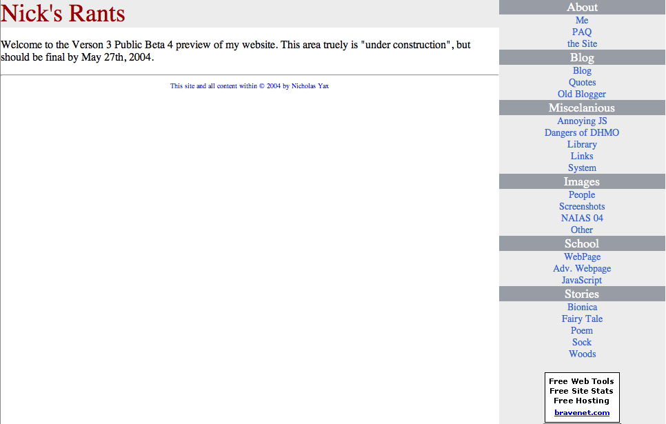 In March 2004, armed with the lessons from betas 1-3, I began work on v3b4, a showcase of all I knew. CSS and JS were planned to be included, and I even tried to put an RSS feed from the blog on then front page. A try to hide my lack of content with eye candy. It was planned to become final on May 27, 2004, but do to looking rather crappy it was a permanent beta.