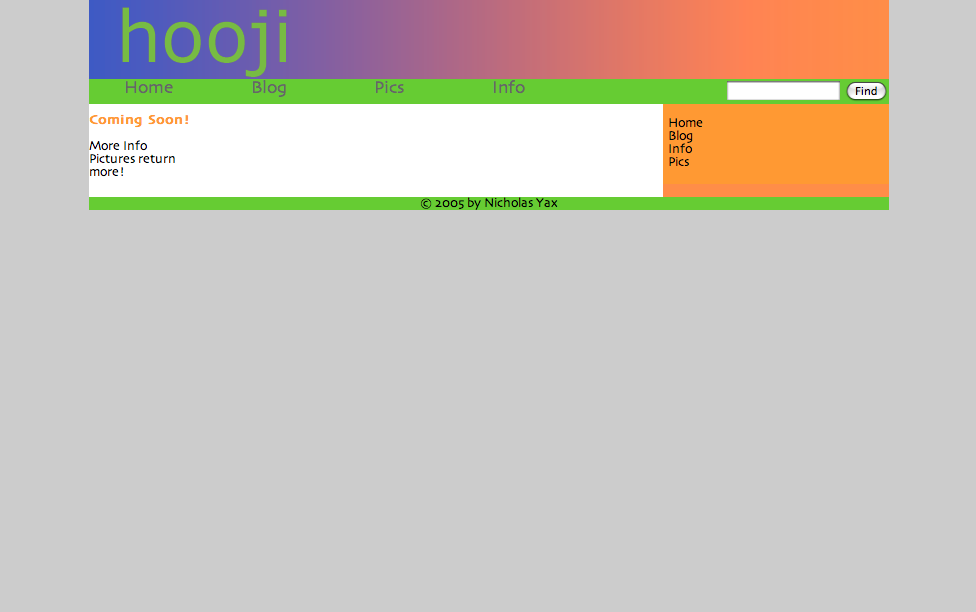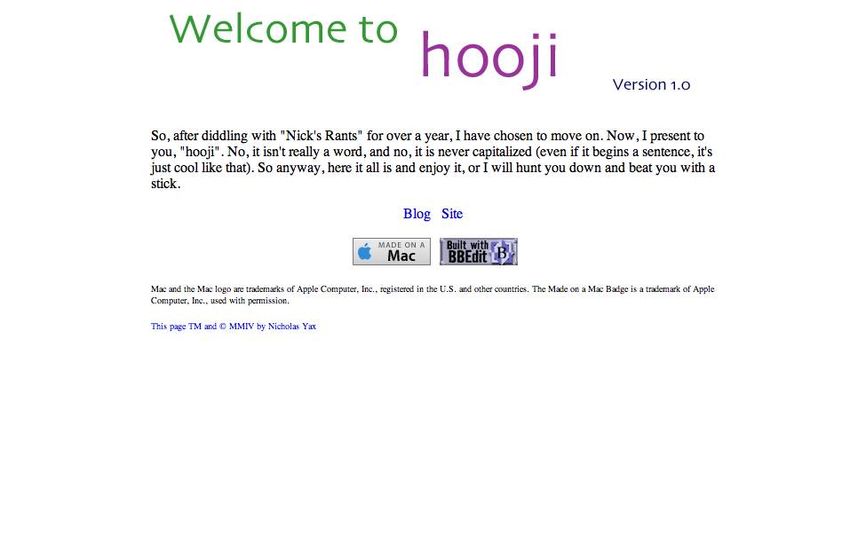 After playing with v3b4 and b5 for a few months, I began implementing some of the changes outlined for b5 in October 2004. It was a plain white with bright colors, stories and pics were now in the blog, and there was no sidebar on the site. It was dubbed hooji 1.0, but is version 4 of the site.